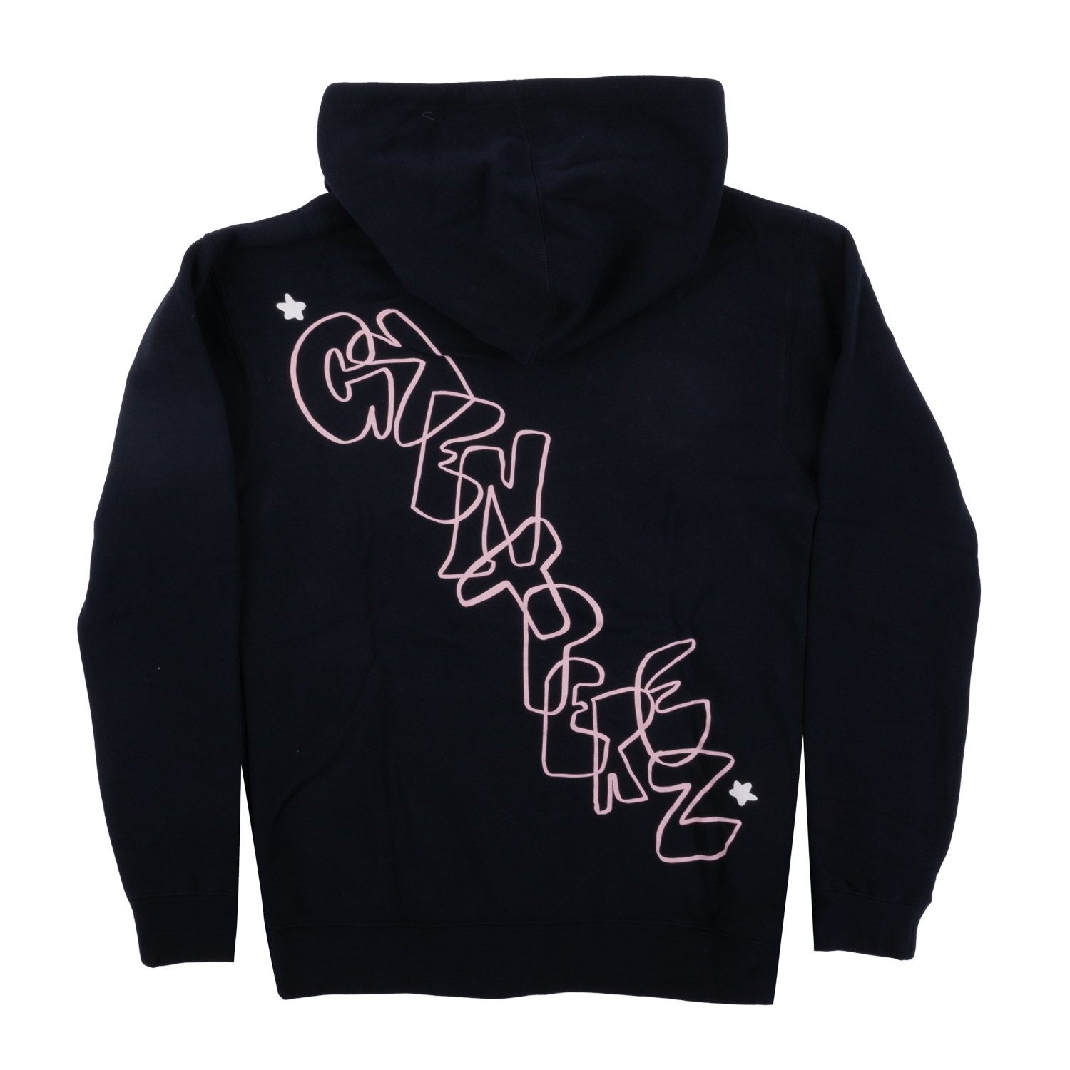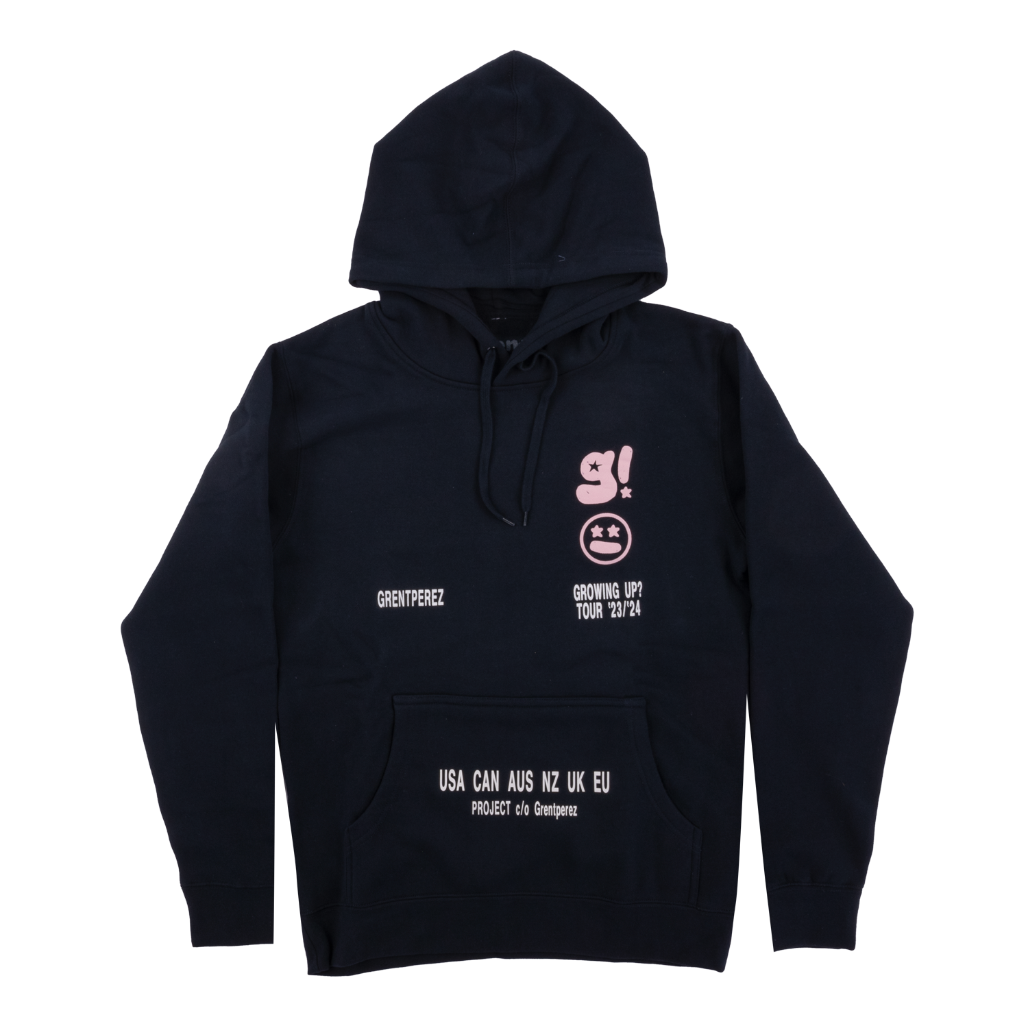Growing Up? tour graphic on front, grentperez abstract logo on back printed on a black hoodie.